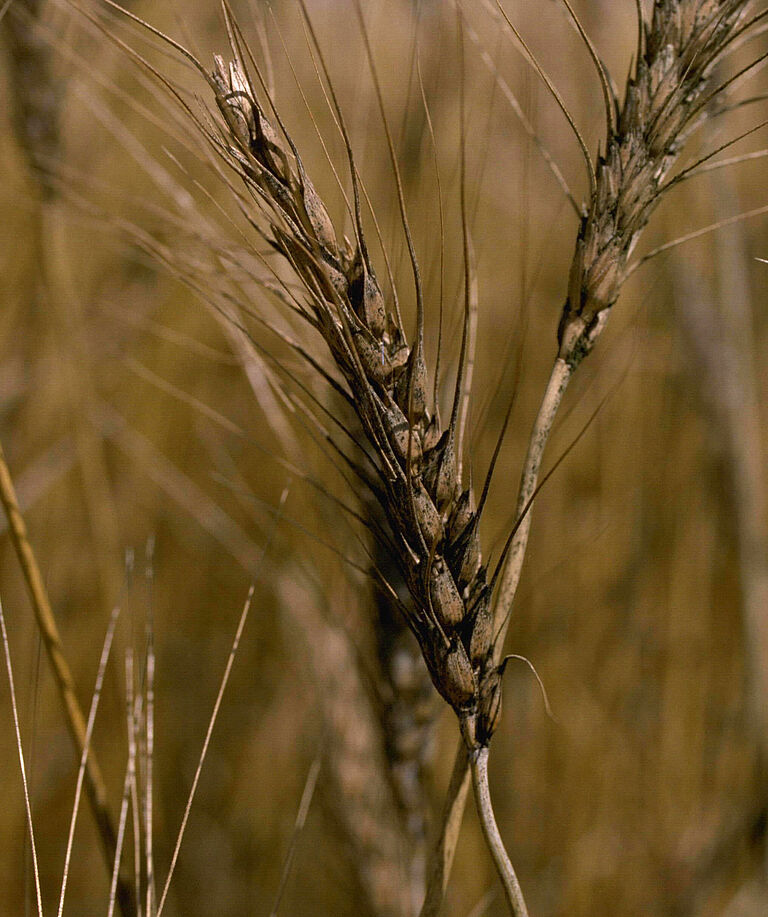 F. graminearum/Gibberella zeae (Fusarium head blight o scab) (anamorfo/teleomorfo) causa el damping-off de las plántulas. En el pie del tallo se produce una decoloración marrón. Las glumas y los granos infectados se vuelven blancos, debido a la deshidratación, y más tarde adquieren un color rojo rosado a medida que se forman esporas. La infección de las espigas disminuye la calidad panadera del trigo y la calidad cervecera de la cebada. Además, se producen micotoxinas, de las cuales DON (deoxinivalenol) es la más conocida. Las micotoxinas son tóxicas para los mamíferos, por lo que se han determinado niveles máximos.
