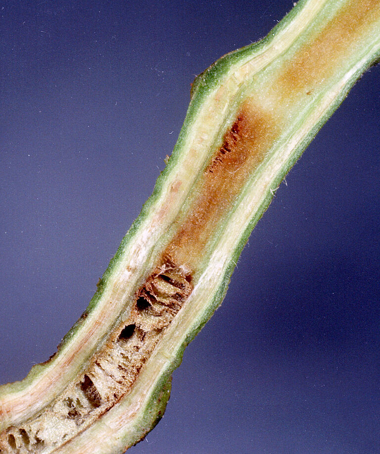 En tomate, las hojas jóvenes son las primeras en resultar afectadas, mostrando signos de marchitez durante el día, que pueden desaparecer en las primeras fases de la infección. En condiciones favorables para la bacteria, toda la planta se marchita poco después de que aparezcan los primeros síntomas. Si las condiciones son menos propicias para el desarrollo de la enfermedad, la planta puede mostrar un desarrollo irregular y producir numerosas raíces adventicias en el tallo. El tejido vascular del tallo adquiere un color marrón y, al cortar el tallo, emanará un fluido bacteriano viscoso de la herida. Esta es la manera de distinguir entre la marchitez provocada por Verticillium o por Fusarium.