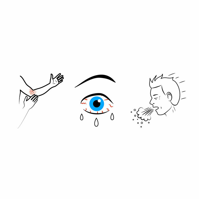 Sin embargo, si entra en contacto con las sustancias en los productos mencionados anteriormente y resulta ser alérgico, puede experimentar síntomas cutáneos (como piel roja y picor o eczema alérgico), nasales (como estornudo, goteo nasal o picor) u oculares (como picor u ojos llorosos).