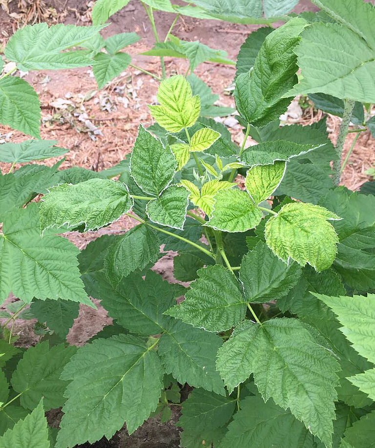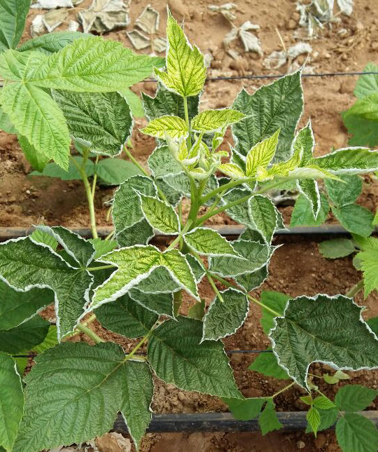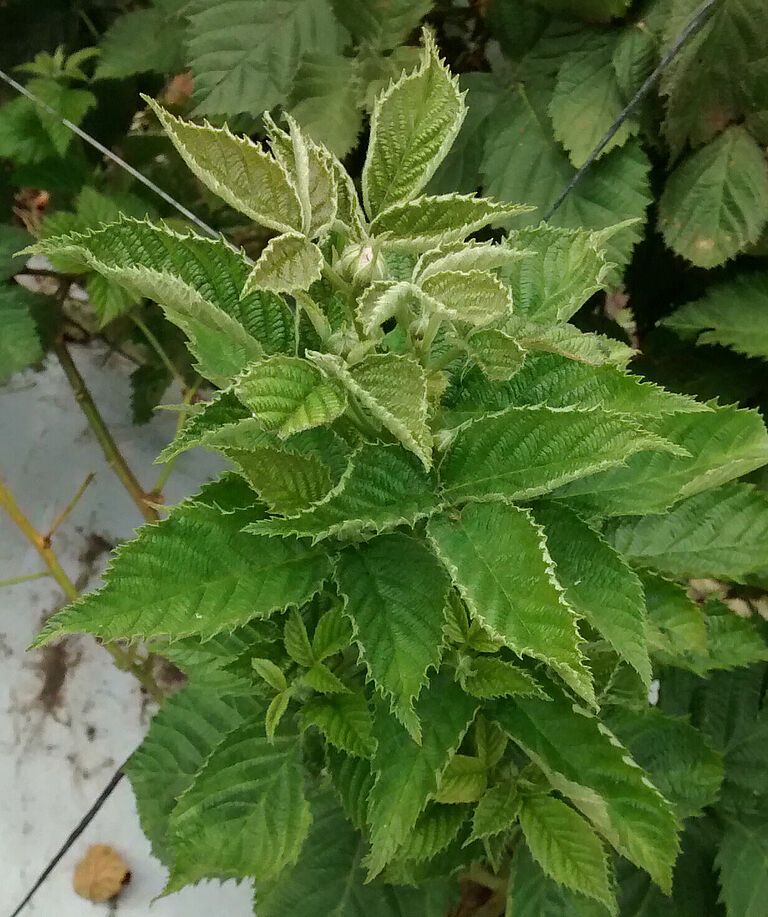 Los ácaros se alimentan sobre todo de la base de la hoja, cerca del pecíolo, debido a lo cual la hoja se vuelve marrón y sus bordes se enrollan. Un síntoma típico de un ataque de ácaro blanco (Polyphagotarsonemus latus) es la aparición de bordes de color marrón oscuro en la base de las hojas jóvenes. En caso de infestación moderada, se observarán puntos marrones a menudo hundidos o rayas marrones que forman una red fina sobre las hojas. En caso de una infestación más seria, esta red se vuelve tan densa que ya no habrá más tejido verde a la vista. En la mayoría de casos, los nervios principales permanecen sin tocar, debido a lo cual destacan como un patrón verde en contraste con el tejido marrón de la hoja. Se observan manchas marrones y acorchadas en los pecíolos y en los tallos.